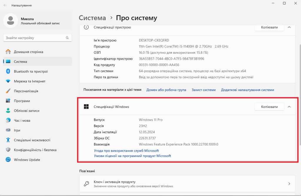Виконавши попередні кроки Ви побачите всю інформацію про Windows 11 у розділі Специфікації Windows , включаючи випуск, версію та номер збірки.